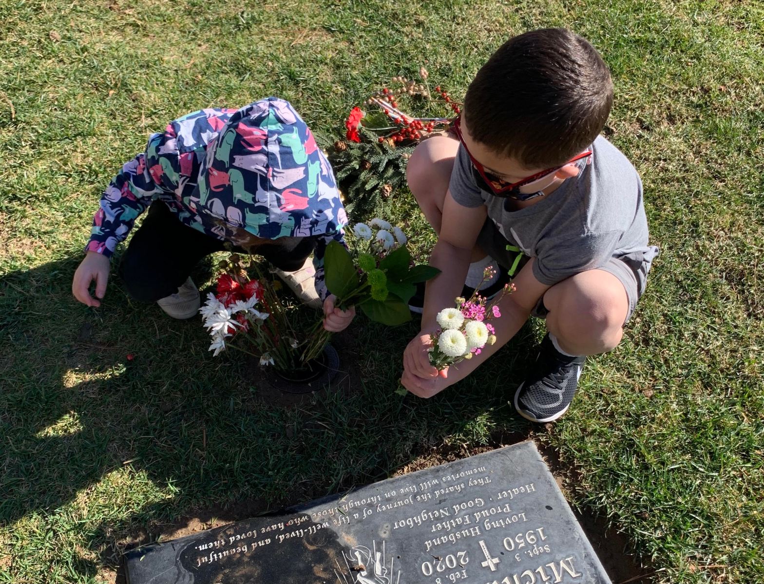 After clearing the grave and replacing the tree with fresh flowers, we prepared to leave. But Paul wanted to stay longer “visiting” our beloved neighbor. Meanwhile, Clare noticed that the recent rain and wind had blown over a lot of the decorations on other graves. Ornaments had scattered into the grass and some had been crushed. She gently straightened and redecorated the trees. The kids imagined the people: who were they, how did they die? Did they have the coronavirus?